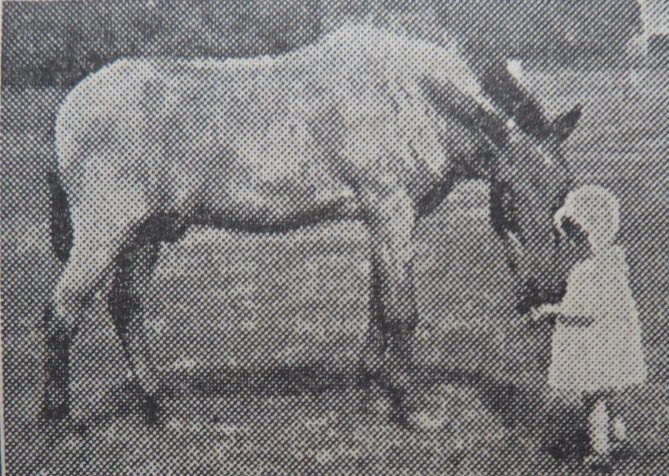 “Roy,” the pony employed by the Darfield Cricket Club, “shot” in characteristic pose – begging a sweet from a tiny visitor.